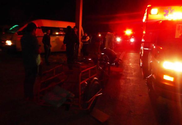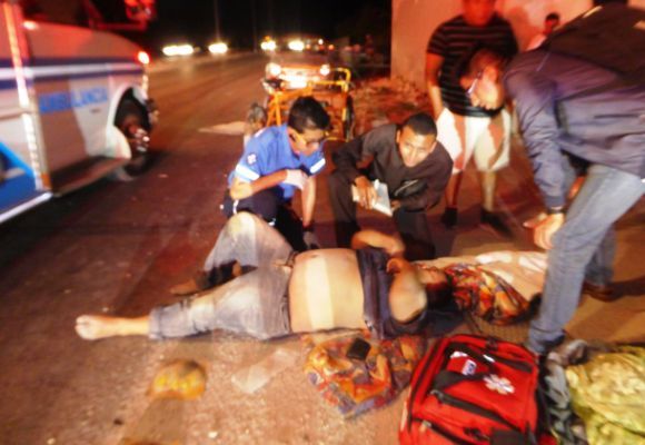 PLAYA DEL CARMEN, Quintana Roo, 3 de abril.- La noche del lunes se registró un aparatoso accidente, al menos cinco personas resultaron lesionadas, el conductor de una combi colectiva fue detenido tras manejar imprudentemente y arrolla a un ciclista por alcance cuando circulaban sobre la autopista el Tintal con calle Flor de Ciruelo, justo a la altura del primer puente del fraccionamiento Real Ibiza.