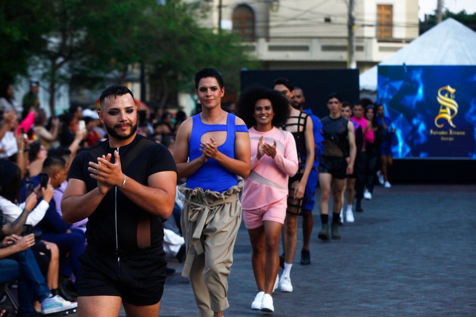 La calle fue testigo de la pasarela, en la que las y los modelos mostraron ropa interior y trajes de baño en colores vibrantes y ropa casual con diseños en transparencias y ‘shorts’ muy cortos, además de diseños drag.