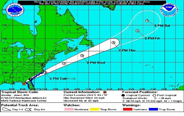 PLAYA DEL CARMEN, Quintana Roo, 6 de Junio de 2016.- La tormenta tropical “Colín” del Golfo de México se localizó el día de hoy a las 20:00 horas en las coordenadas 29.3 grados latitud Norte y 84.7 grados longitud Oeste; aproximadamente a 55 km al Sur/sureste de Apalachicola, Florida, E.U, y a 155 kilómetros al Oeste de Cedar Key, E.U.A., con vientos máximos cerca del centro de 85 kilómetros por hora, con rachas mayores; se mueve al Norte/noreste (40°) a razón de 37 kilómetros por hora, en su amplia circulación ciclónica continúa originando desprendimientos en las bandas nubosas hacia la Península de Yucatán, provocando nublados con lluvias y chubascos dispersos acompañados de actividad eléctrica aislada por la noche y madrugada. Por su dirección de movimiento y alejamiento gradual, no representa ningún riesgo para el estado de Quintana Roo, se monitorea.
