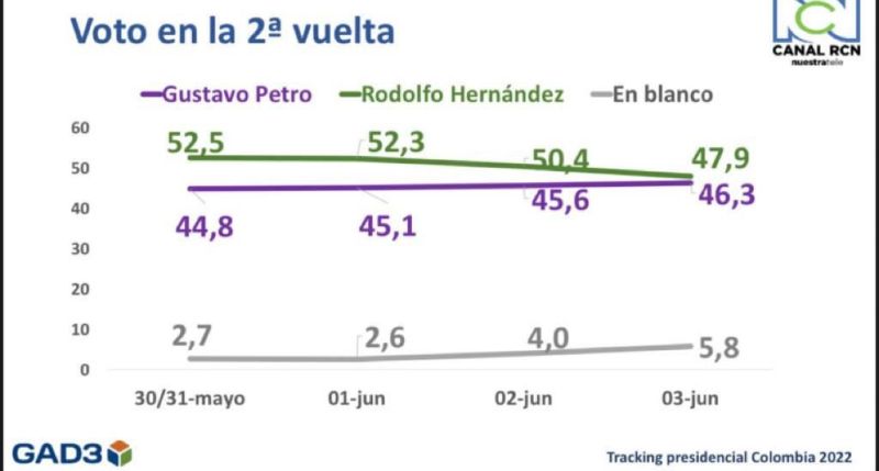 Así, en el escenario político colombiano, la diferencia entre Rodolfo Hernández y Gustavo Petro se viene cerrando y el voto en blanco subiendo rápidamente.