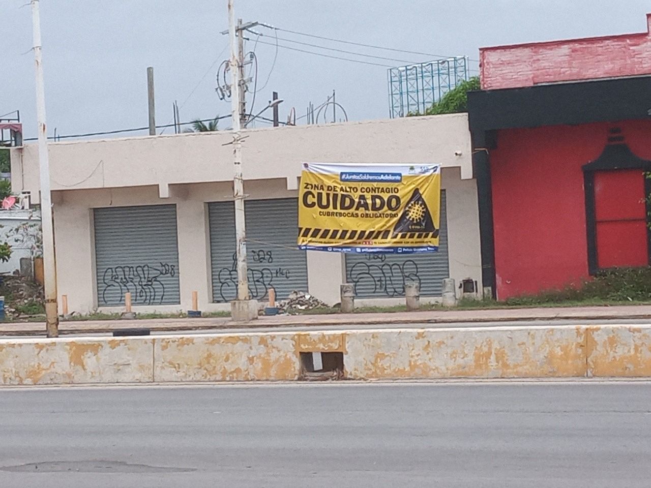 CANCÚN, Quintana Roo, 12 de mayo.- Por carecer de sustento científico comerciantes rechazan las mantas de aviso de zonas de alto contagio por Covid-19, pues afecta más su economía.