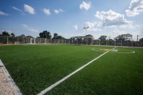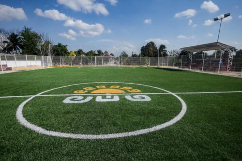 En esta cancha se colocó pasto sintético de alta calidad en más de mil metros cuadrados, porterías, contenedores de basura, reflectores, se construyeron bancas y gradas techadas, enrejado, entre otros trabajos complementarios.