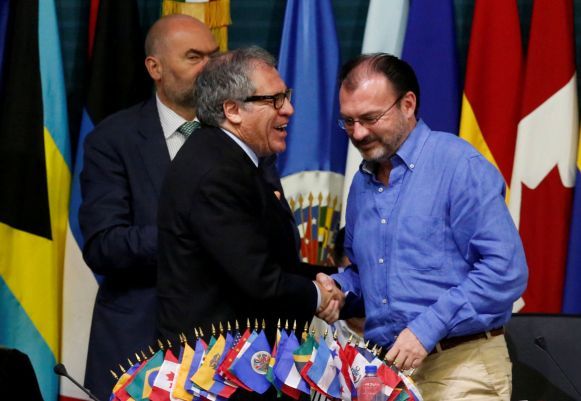 CIUDAD DE MÉXICO, 22 de Junio.- Al concluir los trabajos de la 47 Asamblea General de la Organización de Estados Americanos (OEA), el secretario de Relaciones Exteriores, Luis Videgaray, admitió que si bien no se llegó a una resolución en el tema de la crisis de Venezuela, se logró hacer un llamado al gobierno del presidente Nicolás Maduro, para reconsidere su postura en torno a la concreción de la Asamblea Nacional Constituyente.