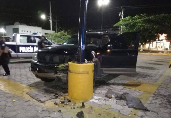 El hecho se registró alrededor de las 01:00 horas, precisamente en el estacionamiento de una cadena de tiendas ubicado en la calle 8 con Avenida 30, cuando el conductor de una camioneta tipo Expedition color negro al dar marcha a la unidad terminó su carrera contra una base de concreto.