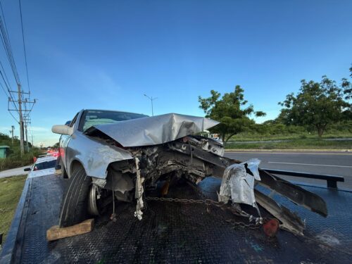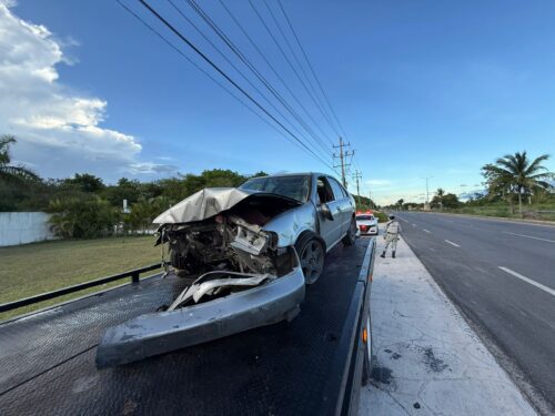 Playa del Carmen.-Un aparatoso accidente se registró la mañana de este martes en la carretera federal 307, cuando un vehículo que circulaba a exceso de velocidad perdió el control, se subió al camellón central y terminó impactándose contra una luminaria, quedando severamente dañado.