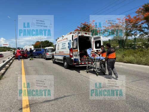 PLAYA DEL CARMEN.- La tarde del sábado, una aparente maniobra imprudente por parte del conductor de un vehículo Dodge Attitude desencadenó una aparatosa carambola sobre la carretera federal 307, a la altura del kilómetro 268, pocos metros después del hotel Barceló y cerca del puente de Puerto Aventuras, en dirección de sur a norte.