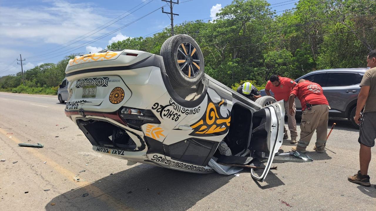 TULUM.- La tarde de este miércoles, un conductor del servicio de transporte que opera en el Aeropuerto Internacional de Tulum protagonizó un aparatoso accidente al volcar sobre la carretera federal 307, a la altura del kilómetro 332.