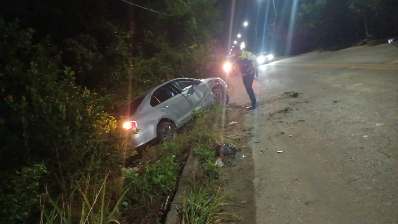 CANCÚN.- Un aparatoso accidente se registró esta madrugada en la Av. Arco Vial, a la altura de la intersección con Av. Rancho Viejo, luego de que el conductor de un vehículo Ibiza gris perdiera el control y terminara volcado dentro del área verde.