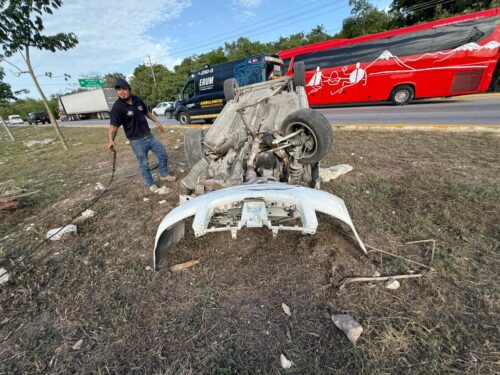 PLAYA DEL CARMEN, Quintana Roo, 11 de agosto de 2025.- La tarde de este domingo se registró un aparatoso accidente tipo volcadura sobre el bulevar Playa del Carmen, en dirección de sur a norte, a la altura de la zona conocida como El Palomar. El percance ocurrió cuando el conductor de un vehículo particular, presuntamente bajo los efectos del alcohol, perdió el control de la unidad, salió de la carpeta asfáltica y terminó volcado sobre el camellón central.