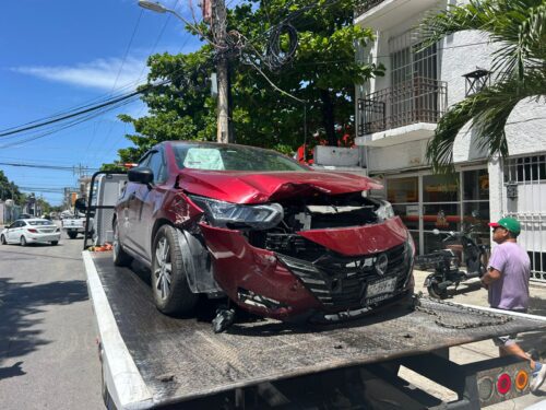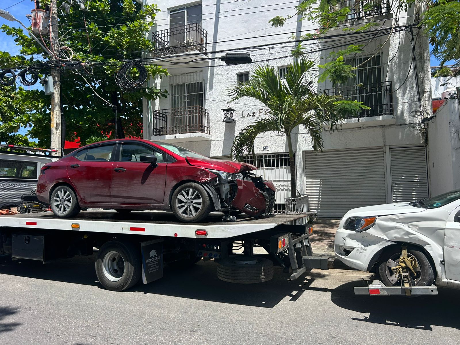 PLAYA DEL CARMEN, Quintana Roo, 13 de julio de 2025.-Un aparatoso accidente de tránsito ocurrió la tarde de este domingo en la colonia Gonzalo Guerrero, luego de que el conductor de un vehículo recién adquirido no respetara un señalamiento de alto y se impactara contra un taxi, dejando como saldo miles de pesos en daños materiales y uno de los vehículos como pérdida total.