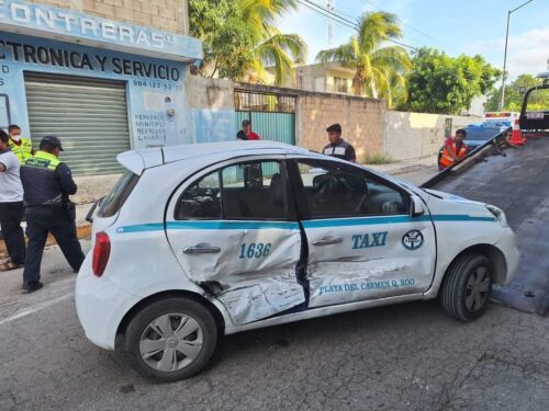 El accidente se registró en la intersección de la calle 100 con la 13, cuando un automóvil Volkswagen Bora, con placas UVP-126H, embistió al taxi rotulado con el número económico 1636, un Nissan March, que circulaba con preferencia de paso.