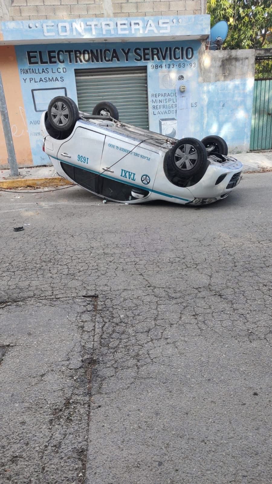 PLAYA DEL CARMEN, Quintana Roo, 1 de junio de 2025.- Un taxi terminó volcado y con daños considerables tras ser impactado por un vehículo cuyo conductor, presuntamente bajo los efectos del alcohol, huyó del lugar abandonando la unidad sin prestar auxilio. El hecho ocurrió la noche del sábado en la colonia Forjadores.