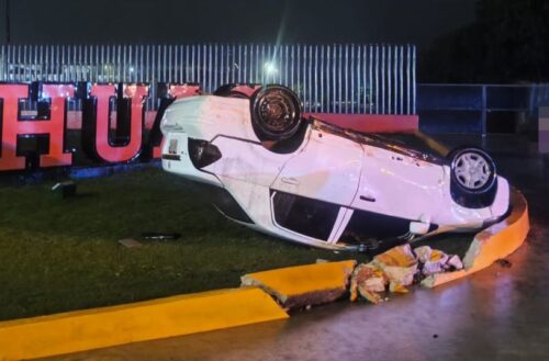 Cancún, Quintana Roo, 6 de noviembre de 2025.– Un vehículo Nissan Tiida blanco terminó volcado la madrugada de este jueves sobre el bulevar Colosio, a la altura de la Universidad Anáhuac, luego de que su conductor perdiera el control y chocara contra la banqueta.