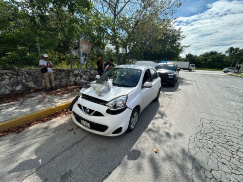 Playa del Carmen, 1 de octubre de 2025. – La imprudencia de una conductora ocasionó un accidente de tránsito sobre el bulevar Playa del Carmen la mañana de este miércoles, cuando intentó incorporarse de manera intempestiva frente a un autobús de transporte foráneo, lo que derivó en un choque en el que también se vio involucrado un taxi local.