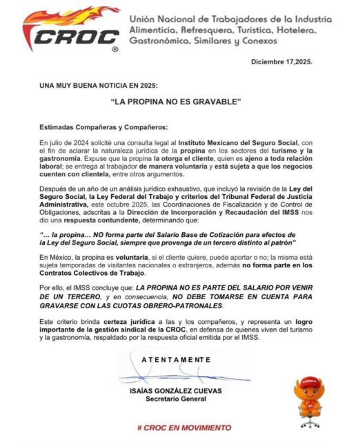 Por ello, el IMSS concluye que: LA PROPINA NO ES PARTE DEL SALARIO POR VENIR DE UN TERCERO, y en consecuencia, NO DEBE TOMARSE EN CUENTA PARA GRAVARSE CON LAS CUOTAS OBRERO-PATRONALES. Por lo cual, este criterio brinda certeza jurídica a las y los compañeros, y representa un logro importante de la gestión sindical de la CROC, en defensa de quienes viven del turismo y la gastronomía, respaldado por la respuesta oficial emitida por el IMSS.
