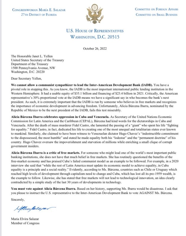 María Elvira Salazar pidió al Departamento del Tesoro votar contra Alicia Bárcena, toda vez que Estados Unidos tiene el voto proporcional del 30 por ciento, lo que “significa que tenemos una voz significativa en quién se convierte en el próximo presidente del BID”.