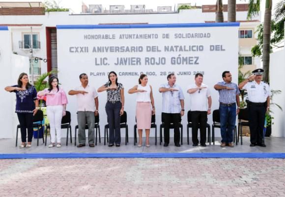PLAYA DEL CARMEN, Quintana Roo, 28 de Junio.- Los servidores públicos del H. Ayuntamiento de Solidaridad rindieron homenaje en la Plaza Cívica “28 de Julio” al gobernador de Quintana Roo, Javier Rojo Gómez, ceremonia que encabezó la Presidenta Municipal de Solidaridad, Samaria Angulo Sala, a 122 años del natalicio del político que fortaleció el desarrollo de la entidad.