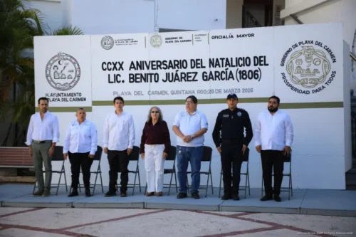Playa del Carmen, Quintana Roo, 20 de marzo de 2026.— El gobierno municipal que encabeza Estefanía Mercado conmemoró el 220 aniversario del natalicio de Benito Juárez García, en una ceremonia cívica que congregó a autoridades municipales y a representantes de logias masónicas asentadas en Playa del Carmen.