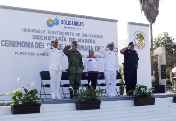 PLAYA DEL CARMEN, Quintana Roo, 24 de noviembre.-  El Gobierno de Solidaridad, encabezado por la Presidenta Municipal, Cristina Torres Gómez, conmemoró el aniversario del Día de la Armada de México con una ceremonia cívica en la que participaron elementos del Ejército Mexicano y la Secretaría de Marina, así como alumnos del Pentathlón Deportivo Militarizado, del Centro de Estudios Tecnológicos del Mar (CETMAR), servidores públicos y ciudadanía.