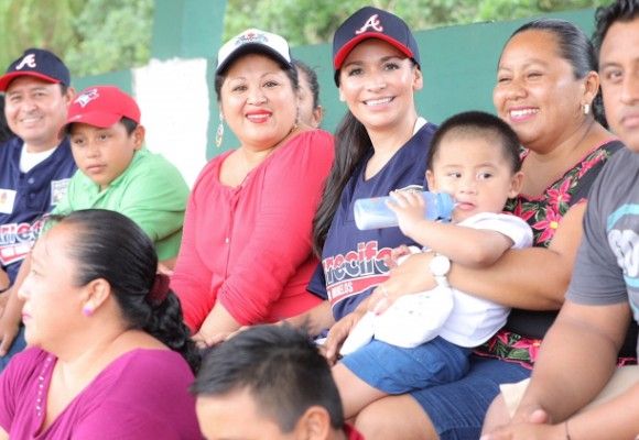 A su arribo al campo de béisbol, Laura Fernández Piña, acompañada por el delegado municipal Leouvín Moysés Medina Cahuich y el director de Deportes, Juan Carlos Povedano, recorrió las gradas para saludar de mano a los aficionados e inclusive platicó con muchos de los asistentes, en una bonita convivencia de domingo familiar.