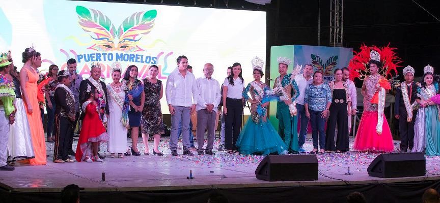 PUERTO MORELOS, Quintana Roo, 18 de febrero.- Colorido y diversión enmarcaron esta noche la coronación de los soberanos del “Carnaval con Encanto, Puerto Morelos 2017. Arrecifes, cenotes y manglar”, Frida I y Alex I, a cargo de la presidenta municipal Laura Fernández Piña.