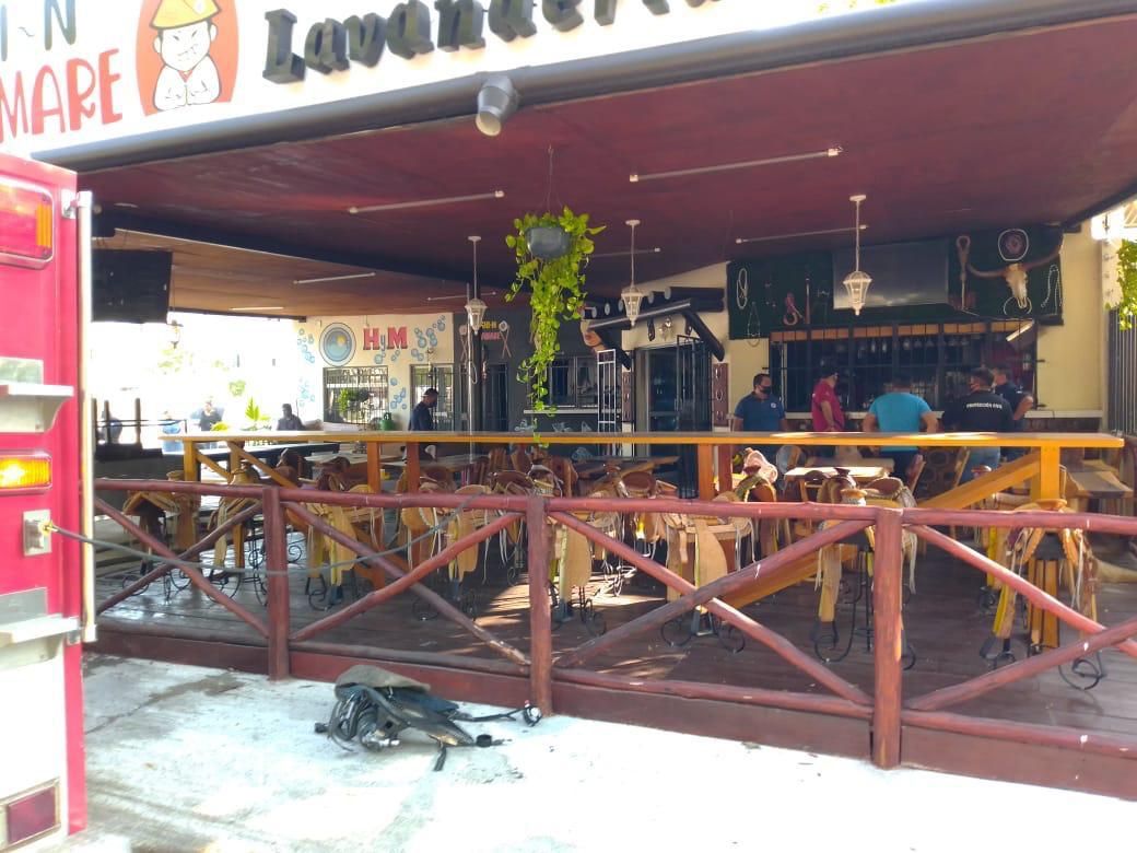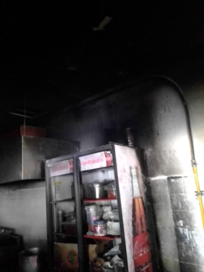 Elementos del honorable cuerpo de bomberos de Solidaridad asistieron al llamado de emergencias para sofocar las llamas en el interior del local de comida que iniciaron debido a un corto circuito en la línea de los refrigeradores lo que ocasionó un fuerte estruendo y que se propagaran las llamas.