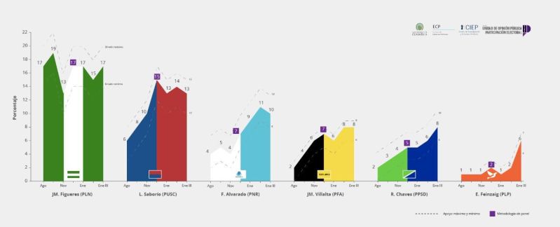 Según la última encuesta del CIEP de la Universidad de Costa Rica (UCR) solo 3 candidatos concentran la mayoría de la intención del voto de los costarricenses, pero de momento ninguno de ellos supera el 20 por ciento de intención de voto. Esta encuesta proyectan una suerte de triple empate técnico entre el expresidente José María Figueres Olsen (Partido de Liberación Nacional, PLN) con el 15 por ciento, la exvicepresidenta Lineth Saborío (Partido Unidad Social Cristiana, PUSC) con 14 por ciento y Fabricio Alvarado (Partido Nueva República, PNR) con el 11 por ciento. Cabe recordar que este último candidato, cantante y pastor pentecostés, ganó la primera vuelta en la elección presidencial pasada (2018) pero luego fue derrotado en la 2 vuelta por el actual presidente Carlos Alvarado.