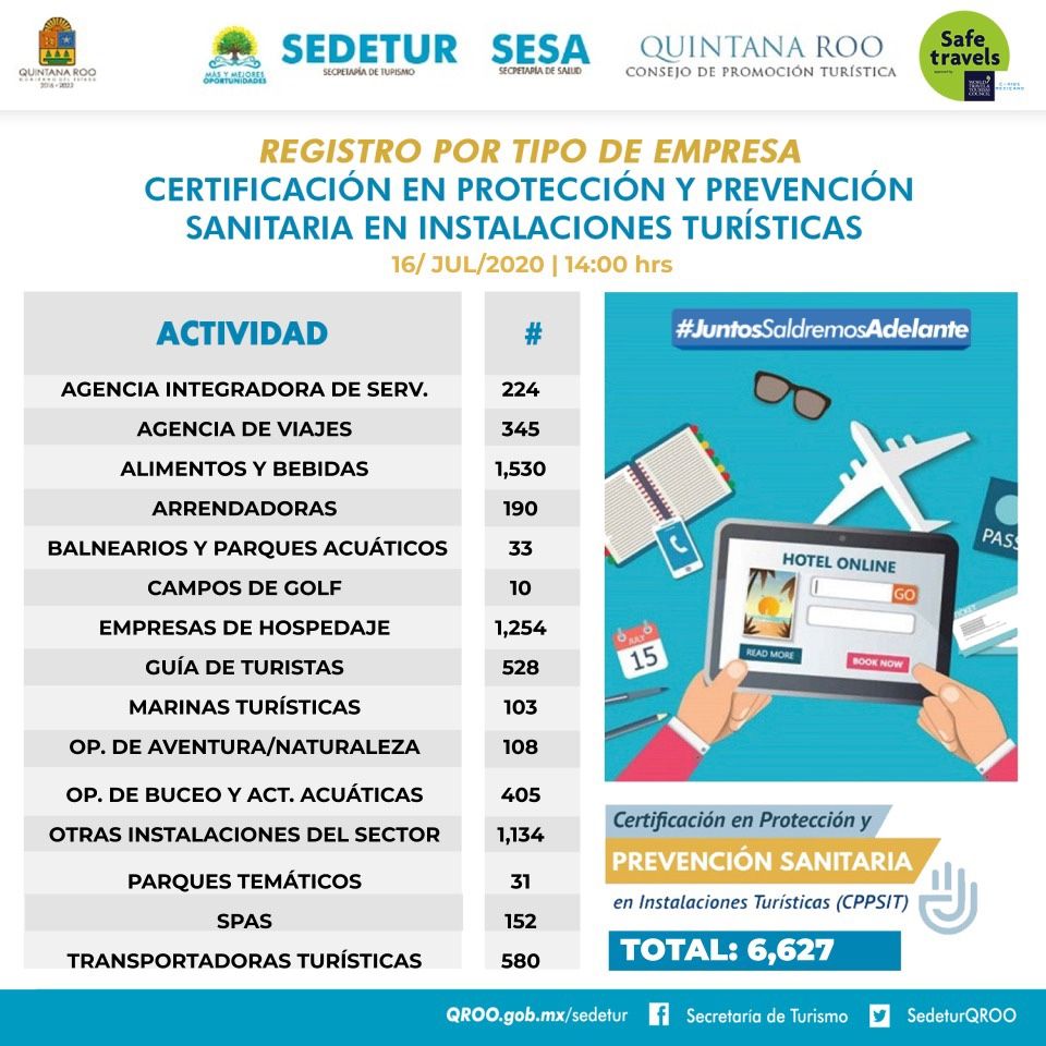 Esto es resultado del compromiso y la responsabilidad de la industria turística de Quintana Roo pues ya son 6,627 empresas de distintos ramos turísticos que ya se han registrado en la Certificado en Protección y Prevención Sanitaria en Instalaciones Turísticas.