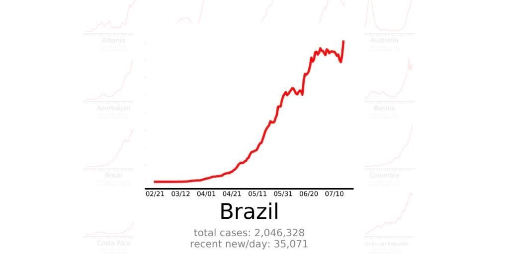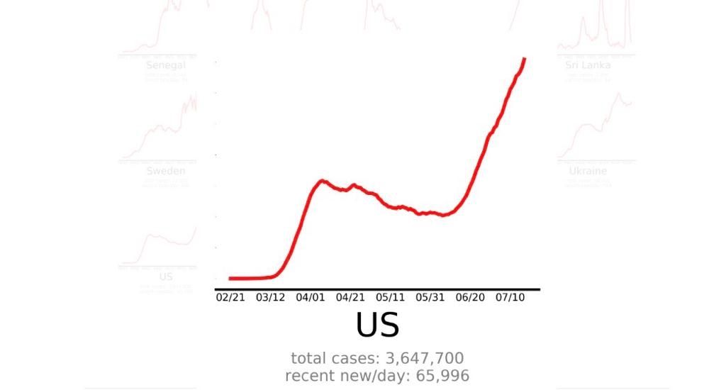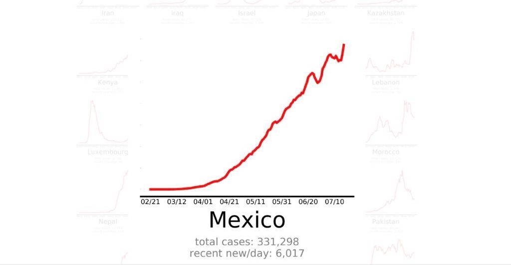 En sus mediciones México, Estados Unidos, Brasil y Reino Unido son los países que destacan por mayores picos de contagios; los primeros tres están en rojo y Reino Unido en amarillo aunque con tendencia a un repunte; sus picos permanecen constantes o bajan muy lentamente (ver gráficas). “Eso significa que van por el camino equivocado”, señaló EndCoronavirus.