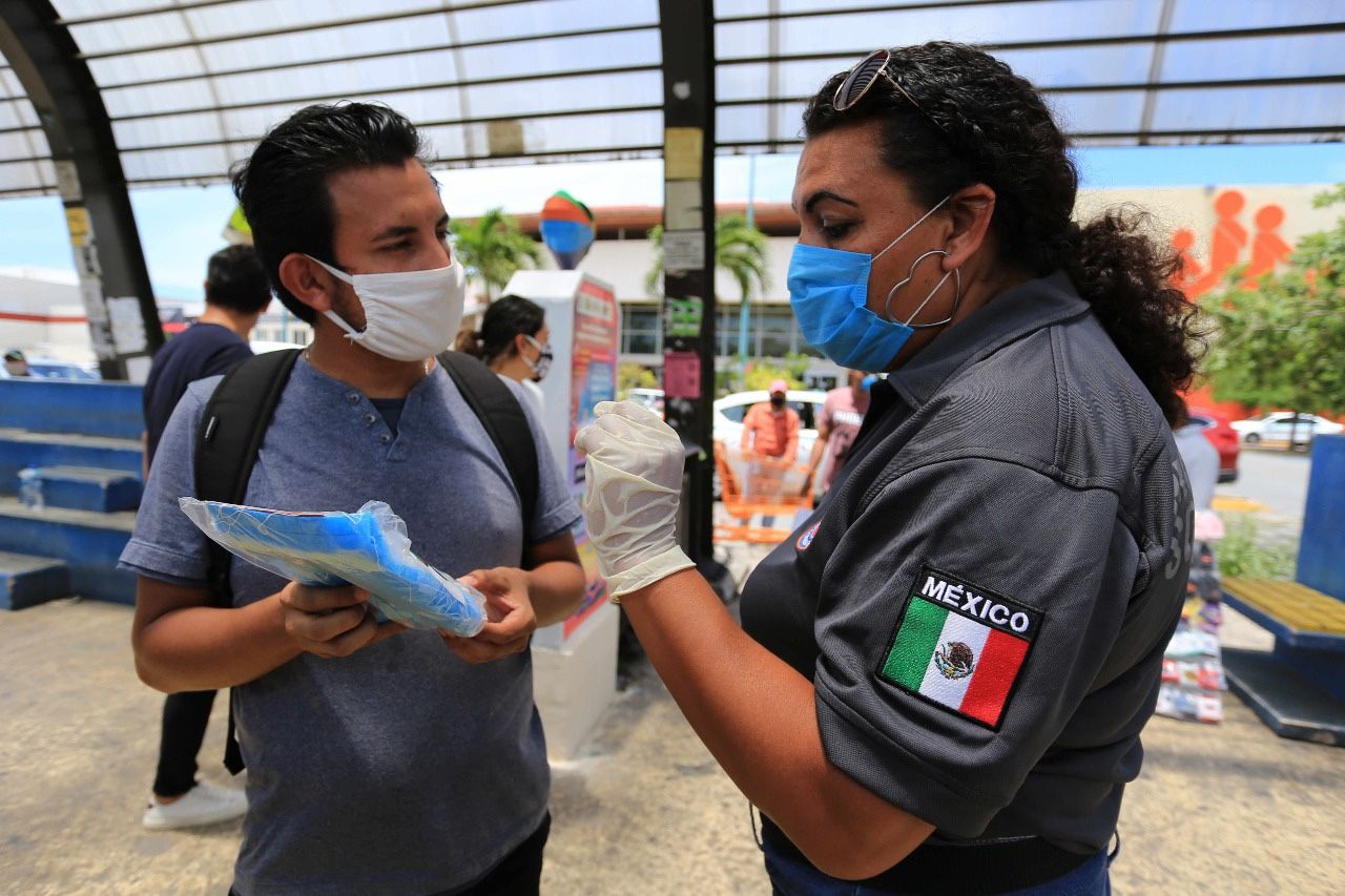 PLAYA DEL CARMEN, Quintana Roo, 22 de julio.- Entrega, Gobierno de Solidaridad, kits sanitizantes a turistas y locales que ingresan a la ciudad en el acceso Playa-Cancún y paraderos de transporte, para recordar no bajar la guardia y continuar medidas de prevención contra el COVID19.