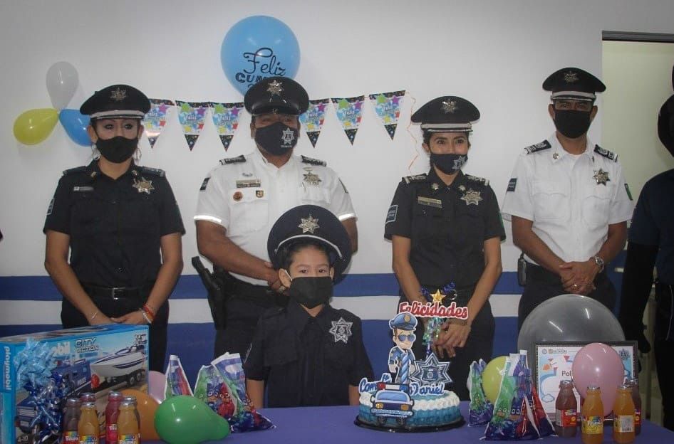 PLAYA DEL CARMEN, a Quintana Roo, 19 de octubre.- En su cumpleaños número 7, Jesús Daniel del Ángel Pérez, cumplió el sueño que tenía de convertirse en policía municipal de Solidaridad. La mañana del 19 de octubre durante el pase de lista que se lleva a cabo en la Secretaría de Seguridad Pública y Tránsito Municipal, el titular de la corporación, comandante Jorge Robles Aguilar, lo nombró “Policía Honorario” por un día.