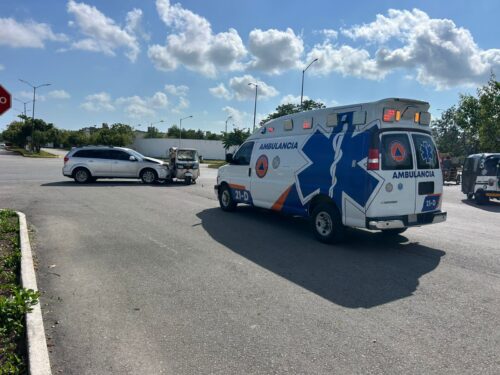 PLAYA DEL CARMEN, Quintana Roo, 22 de diciembre de 2025.—Daños materiales de consideración y dos personas lesionadas fue el saldo de un accidente de tránsito registrado la mañana de este lunes en el fraccionamiento Villas del Sol, luego de que un mototaxi se atravesó en la trayectoria de una camioneta.