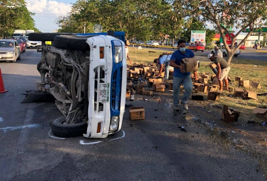 MÉRIDA, Yucatán, 06 de mayo. – Una importante cantidad de cerveza quedó tirada en el pavimento del carril interior de anillo periférico luego de que se volcara un camión repartidor con al menos 200 cartones de cerveza.