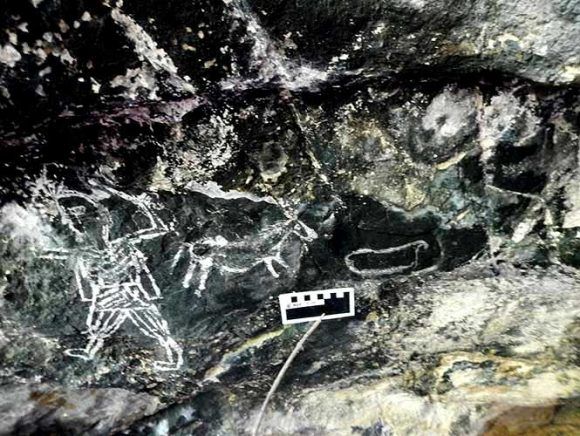 De una de las cuevas se hallaron seis paneles, tres de ellos con figuras antropomorfas, zoomorfas y geométricas trazadas con pintura blanca.