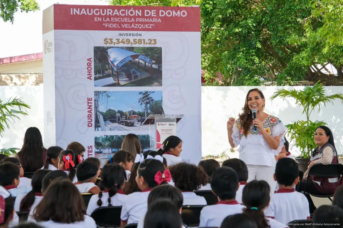 Chetumal, 11 de marzo de 2026.– “Cada obra que se realiza en una escuela es una apuesta por el futuro, por los sueños de quienes llenan las aulas de ilusión y de quienes creen firmemente en el poder transformador de la educación”, expresó la gobernadora Mara Lezama Espinosa al inaugurar el domo ligero de la Escuela Primaria “Fidel Velázquez”, en esta capital.