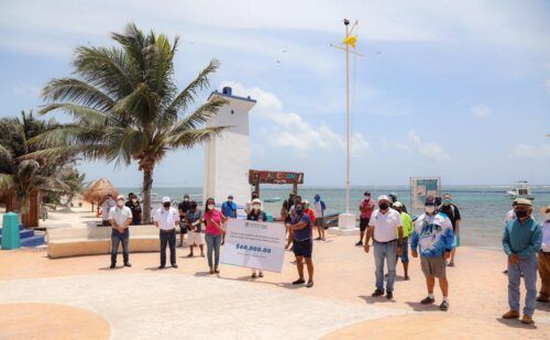 PUERTO MORELOS, Quintana Roo, 9 de agosto.- La presidenta municipal Laura Fernández Piña se reunió en el muelle de pescadores con integrantes del sector náutico de Puerto Morelos, a quienes entregó un apoyo económico para la reactivación de seguros de las embarcaciones, y con ello alivianar un poco el duro impacto que han sufrido a causa de la emergencia sanitaria por la pandemia de Covid-19.