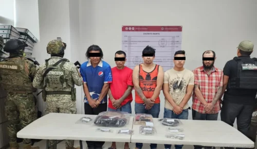 Cancún, Quintana Roo, 13 de febrero de 2026.- Tras solicitar y obtener, de jueces de control, las órdenes de cateo correspondientes, la Fiscalía General del Estado, en coordinación con la Secretaría de la Defensa Nacional, Secretaría de Marina, Guardia Nacional y Policía Estatal y Municipales, cumplimentó cinco mandamientos judiciales: tres en este municipio, uno en Playa del Carmen y uno más en Cozumel, donde aseguraron presuntos estupefacientes, un arma de fuego y capturaron a cinco masculinos por su posible relación en hechos probablemente constitutivos de delitos contra la salud en su modalidad de narcomenudeo.