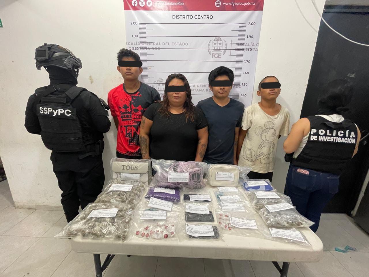 Los asegurados fueron identificados como Rosa Isela “N”, de 28 años, originaria de Cozumel; Luis “N”, de 20 años, originario de Tabasco; Manuel de Jesús “N”, de 25 años, originario de Chetumal; y Braulio Manuel “N”, de 20 años, originario de Playa del Carmen.