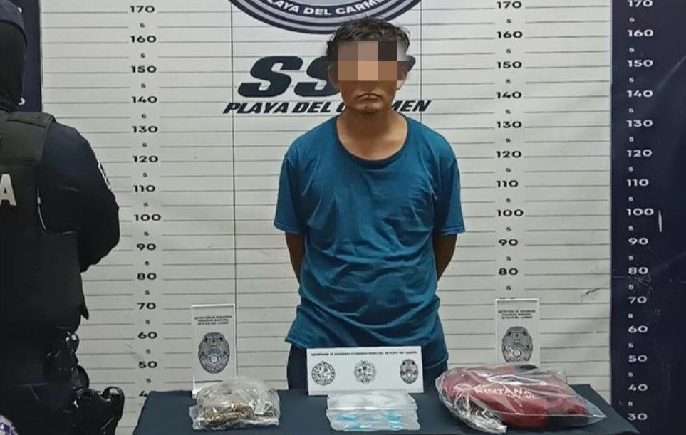 PLAYA DEL CARMEN, Quintana Roo a 3 de agosto de 2025.– Elementos de la Secretaría de Seguridad Ciudadana de Playa del Carmen detuvieron a un joven en el fraccionamiento Villas del Sol por su presunta participación en delitos contra la salud en su modalidad de narcomenudeo.
