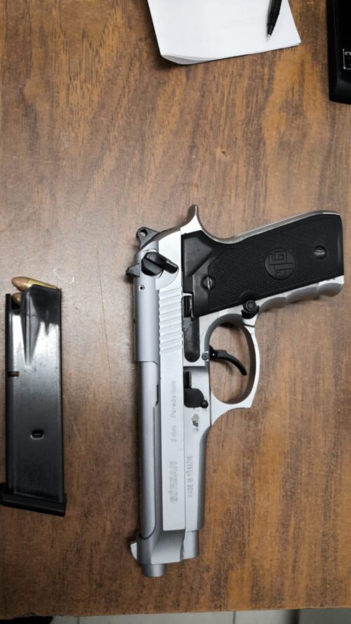Al preguntarle el motivo de salir corriendo y que había guardado en su mochila, solo respondió con insultos a la policía, por lo que procedieron a revisar sus pertenencias y encontraron un arma de fuego, 9MM, tipo escuadra, corta, color plateada con negro y 15 cartuchos.