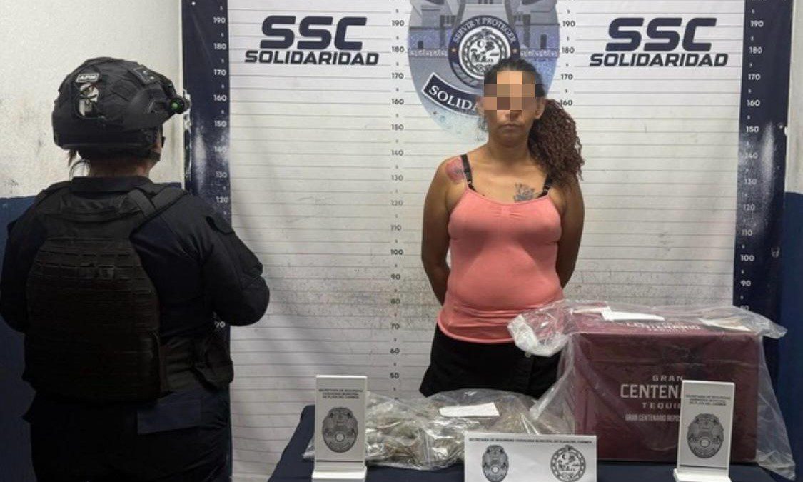 Playa del Carmen, Quintana Roo, a 20 de abril de 2025.– Elementos de la Secretaría de Seguridad Ciudadana Municipal (SSCM) detuvieron a una mujer en posesión de 54 dosis de presunta marihuana durante un operativo de vigilancia en el fraccionamiento Villas del Sol.