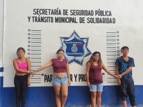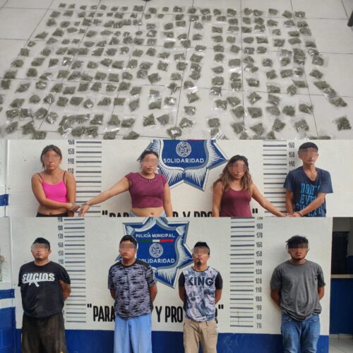 PLAYA DEL CARMEN, Quintana Roo, 33 de agosto.- Como resultado de un fuerte operativo de búsqueda, policías municipales de la Secretaría de Seguridad Pública y Tránsito Municipal de Solidaridad dan golpe a la delincuencia al asegurar a 8 sujetos, 3 cargadores de arma de fuego con 20 cartuchos cada uno, 3 paquetes que contenían distribuidamente 180 bolsas que tenían en su interior una sustancia similar a la droga conocida como crack, 4 paquetes que en su interior contenían distribuidamente 254 bolsas con hierba verde y seca con las características de la marihuana, una bolsa emplayada con la misma hierba, 4 radios de comunicación y 2 chalecos antibalas.