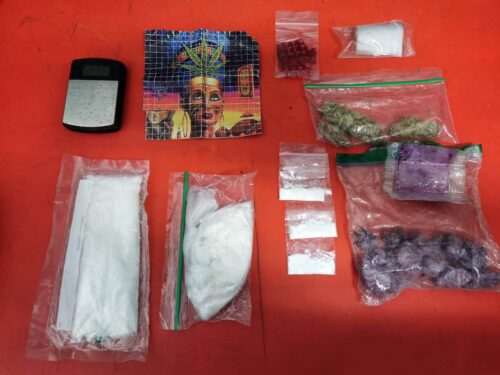 Durante la inspección le encontraron en el interior del automóvil una mochila en color café en la cual contenía 2 bolsas de material sintético transparente que contenían un polvo color blanco con características similares a la cocaína, una bolsa transparente conteniendo una sustancia granulada color roja , 3 bolsitas tipo ziploc conteniendo cada una en su interior polvo blanco, una bolsa de material sintético conteniendo un cuadro de papel de diferentes colores, un cuadro de plástico color rojo y vegetal verde y seco con las características propias de la droga conocida como marihuana.
