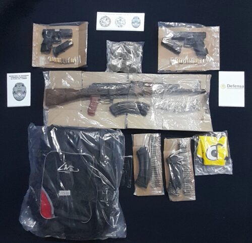 Al efectuar la inspección, los elementos aseguraron diversos envoltorios con posible marihuana, tres armas de fuego, cinco cargadores, más de 100 cartuchos útiles, un teléfono celular y un vehículo, entre otros objetos que quedaron bajo resguardo.