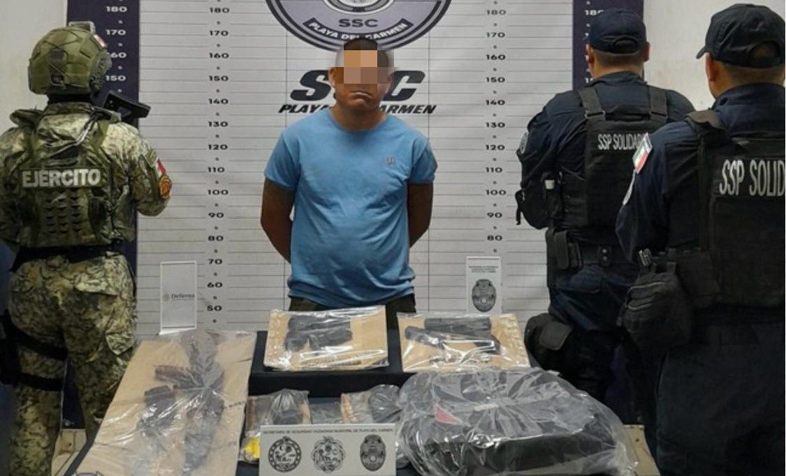 PLAYA DEL CARMEN, Quintana Roo, 20 de julio de 2025.- Elementos de la Secretaría de Seguridad Ciudadana de Playa del Carmen aseguraron a un individuo en posesión de presunta droga y armamento en la colonia irregular El Tesoro, durante un operativo de vigilancia en coordinación con la Secretaría de la Defensa Nacional (SEDENA).