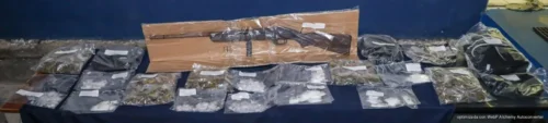 Asimismo, a los señalados les localizaron un arma de fuego tipo rifle con cargador metálico con siete cartuchos útiles, una mochila de color negro, una piernera negra, una mariconera gris, una bolsa beige, hierba verde y seca con características similares a la marihuana, sustancia granulada con apariencia de cristal y polvo blanco similar a la droga conocida como cocaína.