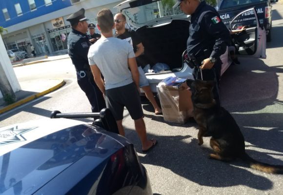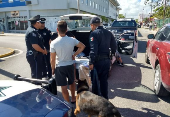 Los hechos ocurrieron sobre la calle 12 bis, entre las calles 25 y 20 en la colonia Centro, de Playa del Carmen, de acuerdo a la información preliminar, en el operativo realizado por elementos de la Policía Federal, fue detenido un automóvil Seat color blanco, con placas de circulación NCA7419 del Estado de México, al inspeccionar el vehículo fue encontrado en la cajuela una caja de cartón embalada con plástico transparente, proveniente del servicio de paquetería Fedex, con ayuda de un binomio canino entrenado para identificar, estupefacientes, armas o divisas, se confirmo que el contenido de la caja era hierva verde con características propias a la mariguana.