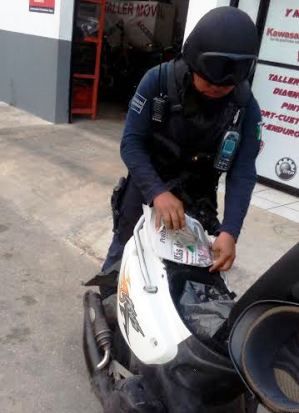 Uniformados de la Policía Municipal Preventiva se percataron que dos sujetos a bordo de una motocicleta tipo BMS, con placas de circulación JKP8L, del estado se desplazaban con una actitud sospechosa ante la presencia de los agentes.
