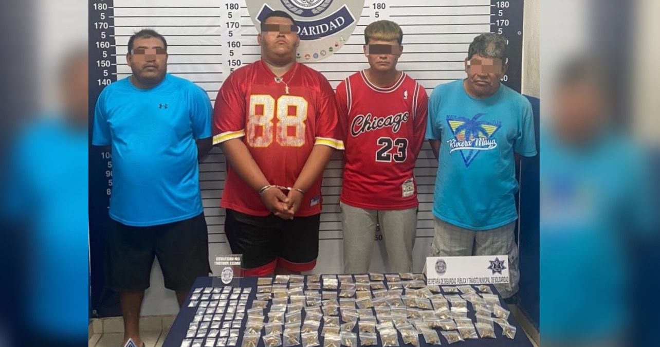 Los ahora detenidos Mario “N” de 37 años de edad, originario de la ciudad de Cancún, Jesús “N” de 15 años de edad, Julián “N” de 37 años de edad y Antonio “N” de 20 años de edad procedentes de Tabasco, fueron ubicados por los oficiales la tarde del 8 de abril tras un reporte de posible venta de drogas en un camino de acceso libre a playa Paraíso, junto a dos vehículos marca Chevrolet, tipo Chevy y marca Volskwagen, tipo Jetta.