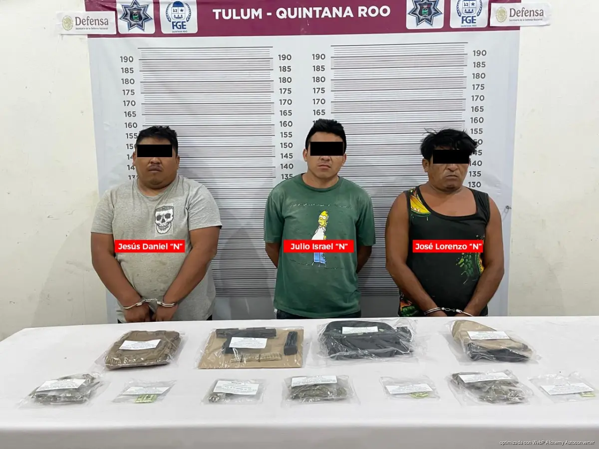 Tulum, 14 de febrero de 2026.– La Fiscalía General del Estado de Quintana Roo informa que, como resultado de trabajos de investigación derivados de una denuncia anónima, elementos de la Policía de Investigación, en coordinación con elementos de la Secretaría de la Defensa Nacional y Policía Municipal, lograron la detención en flagrancia de Jesús Daniel “N”, Julio Israel “N” y José Lorenzo “N”, en la comunidad de Francisco Uh May, municipio de Tulum.